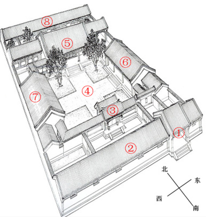 ② 進大門后的第一道院子,南面有一排朝北的房屋,叫做倒座,通常作為賓客居住、書塾、男仆人居住或雜間。